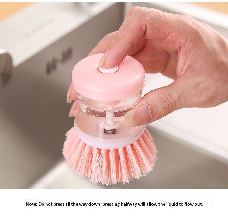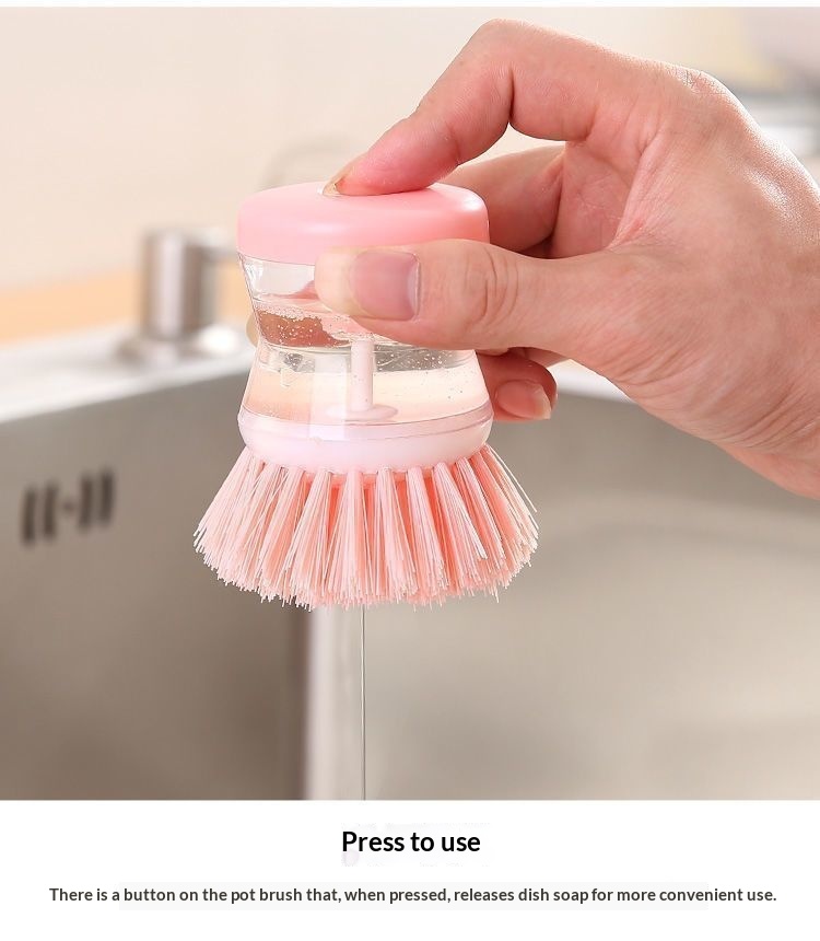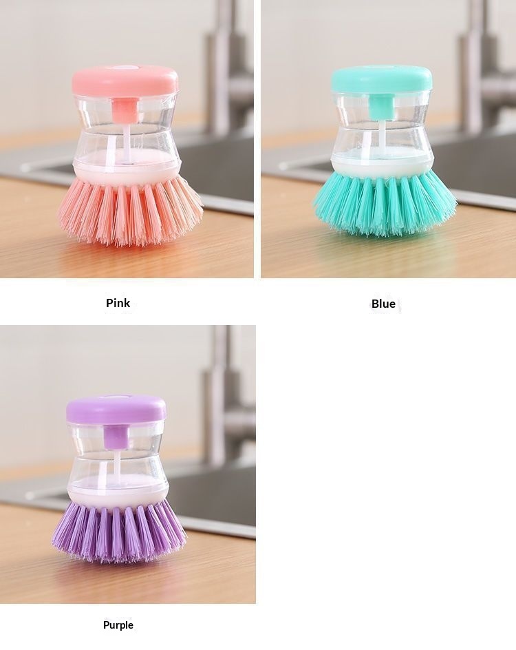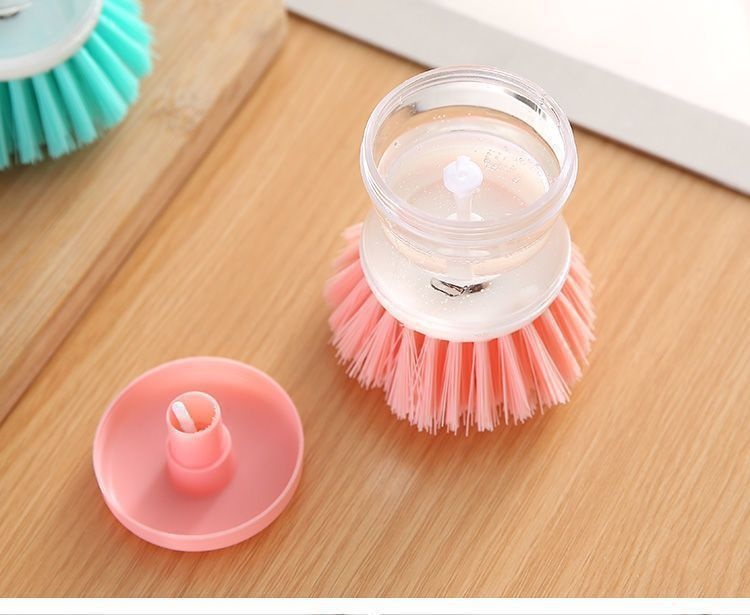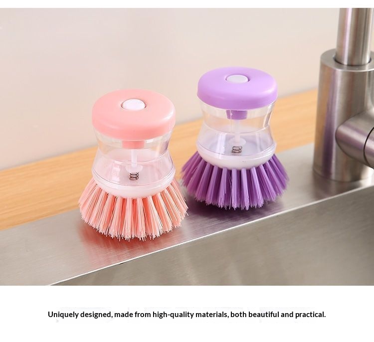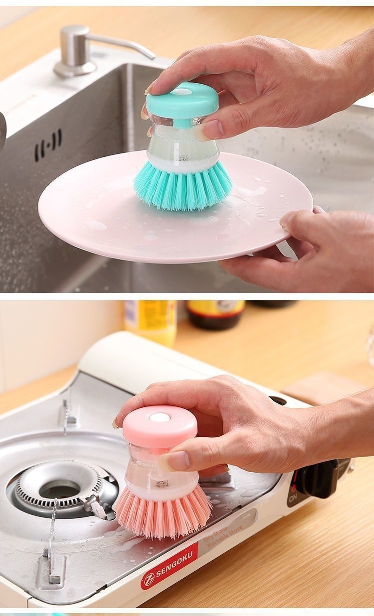 Das clevere 2-in-1 Design kombiniert eine starke Reinigungsbürste mit einem nachfüllbaren Spülmittel-Tank. Einmal drücken = perfekt dosiert. Fertig.